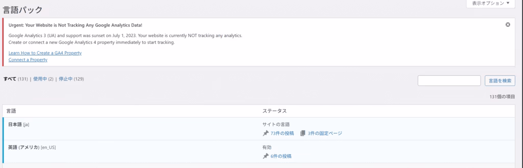 wordpressのダッシュボードに、「言語」という項目が追加されます。デフォルトではこのように、英語になっています。