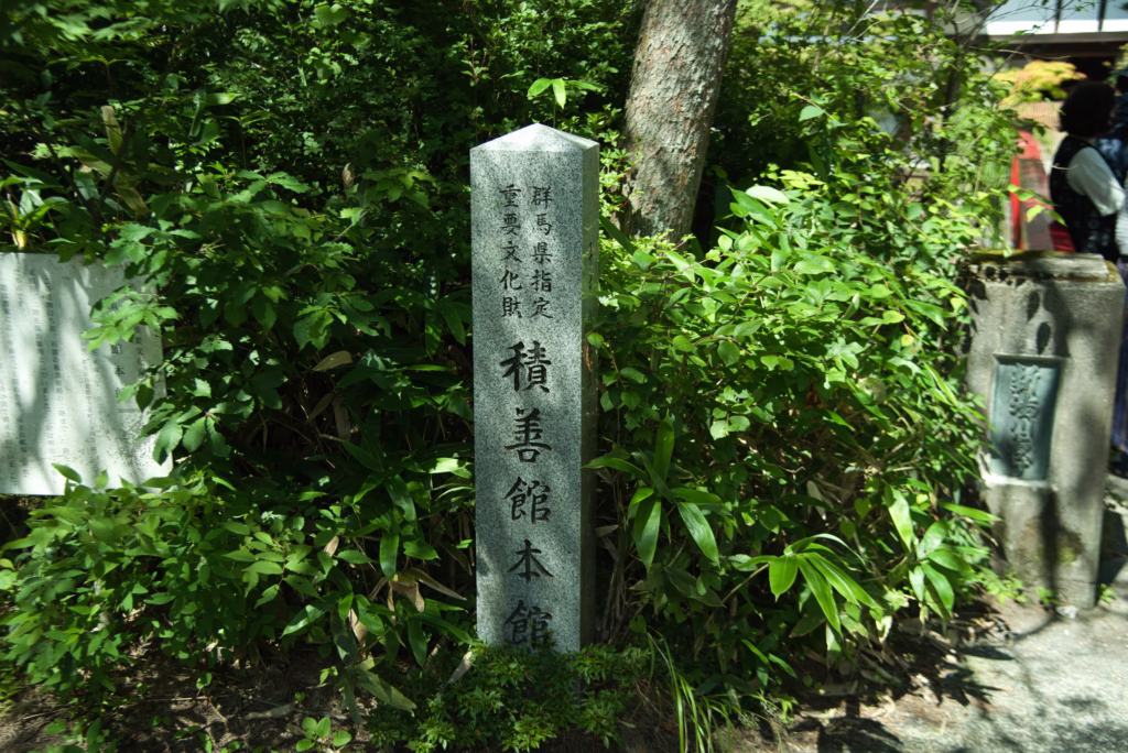 「群馬県指定重要文化財 積善館本館」と刻まれた石碑が、その長い歴史を物語っています。
