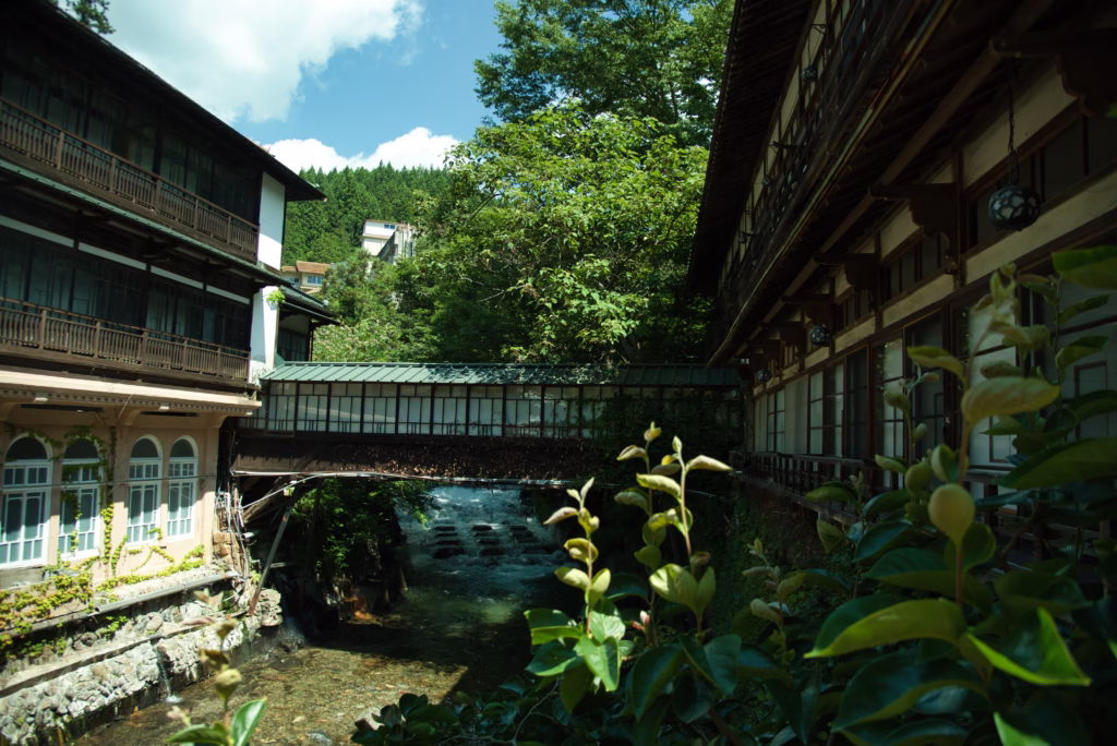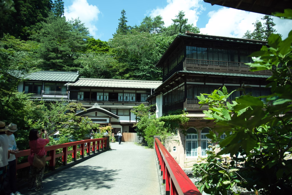 まるで時が止まったかのような、歴史を感じさせる積善館。赤い「慶雲橋」が、訪れる人々を非日常の世界へと誘います。