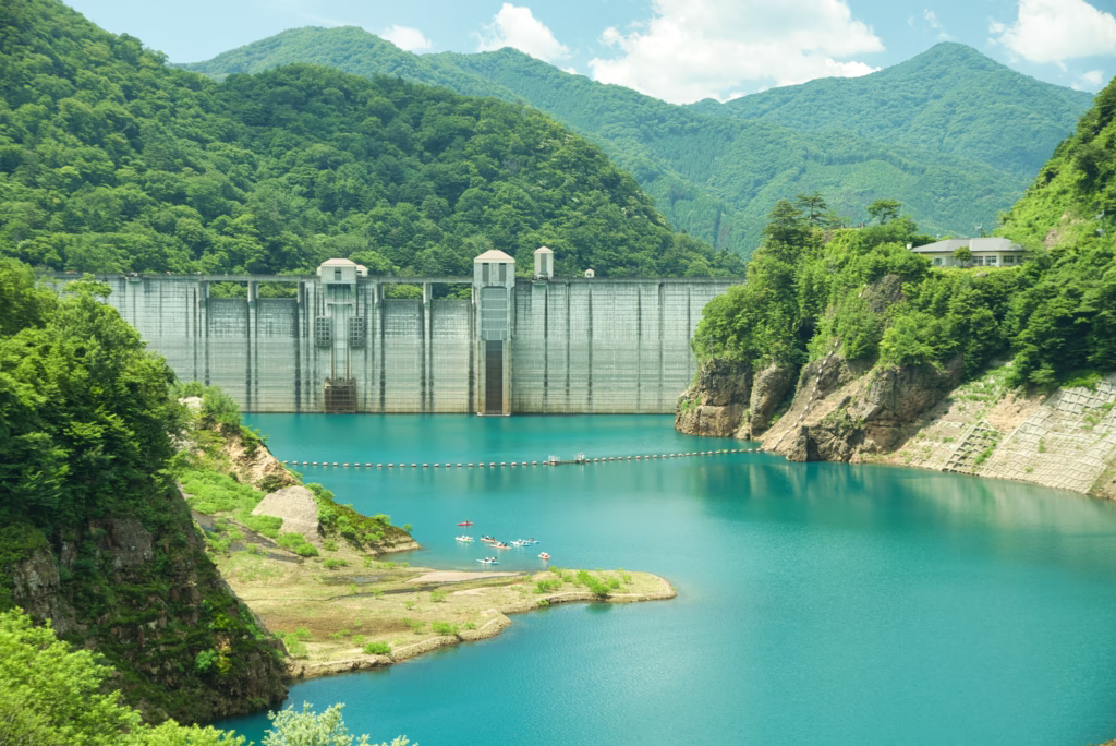 息をのむほど美しいコバルトブルーの湖水が広がる奥四万湖。緑豊かな山々に囲まれ、まるで別世界のような静けさです。四万川ダムの壮大な姿と、エメラルドグリーンに輝く湖。湖面ではカヌーを楽しむ人々の姿も見られ、自然との一体感を満喫できます。