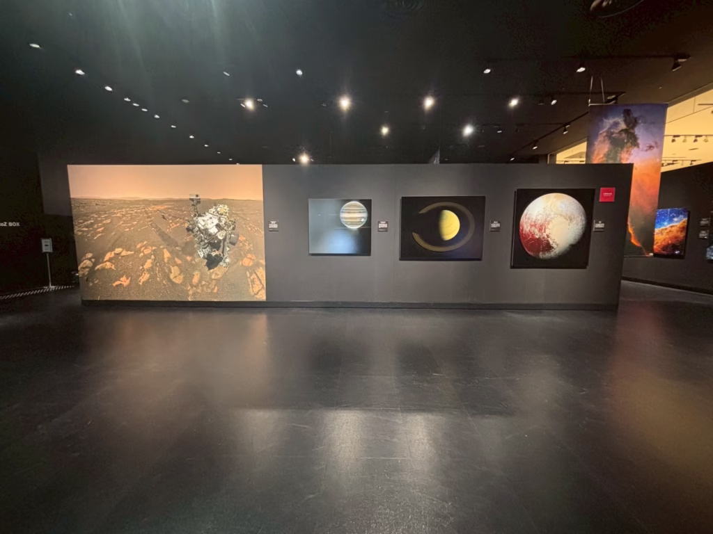 NASAの画像はネットでも見ることができますが、ここで見る価値は**「圧倒的な没入感」**にあります。スマホの画面で見るのと、壁一面の巨大プリントで見るのとでは、受ける印象が全く違いました。