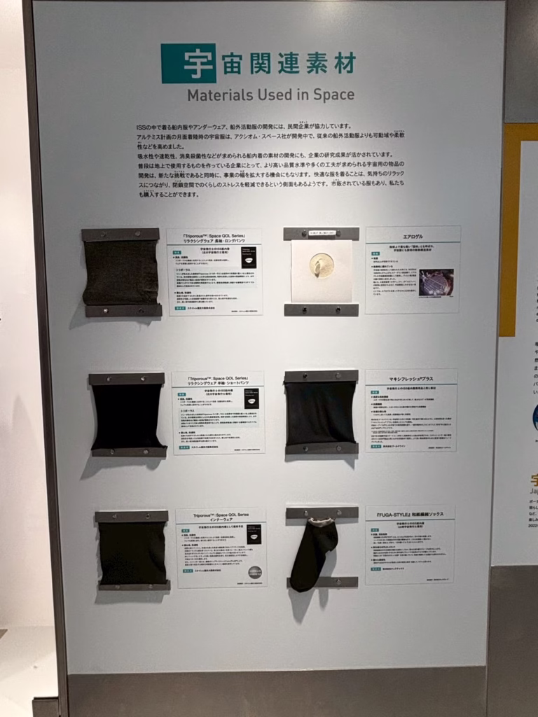 お風呂に入れない宇宙空間でも快適に過ごすための、消臭機能などが施されたハイテク衣類も展示されていました。