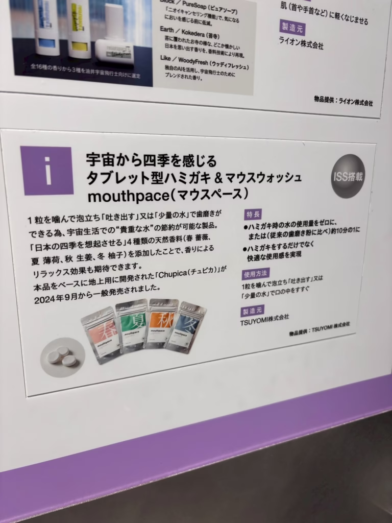 こちらはISS(国際宇宙ステーション)でも使われる技術を応用したアイテム。水が貴重な宇宙ならではのタブレット型ハミガキ「mouthpace」など、工夫が詰まっています。