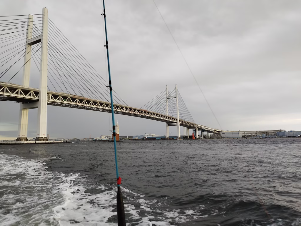見てください、このロケーション!横浜ベイブリッジを下から眺めながらの釣り。青い竿先が海面に映えます。曇り空でしたが、このインダストリアルな風景も横浜らしくて素敵です。