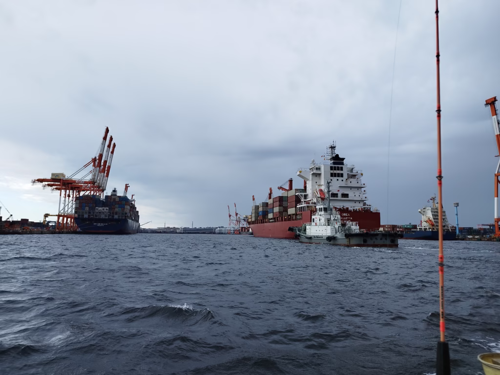 港湾部ならではの大型船やガントリークレーン(キリン)を横目に。赤い竿と赤いクレーンのコントラストが良い感じ。