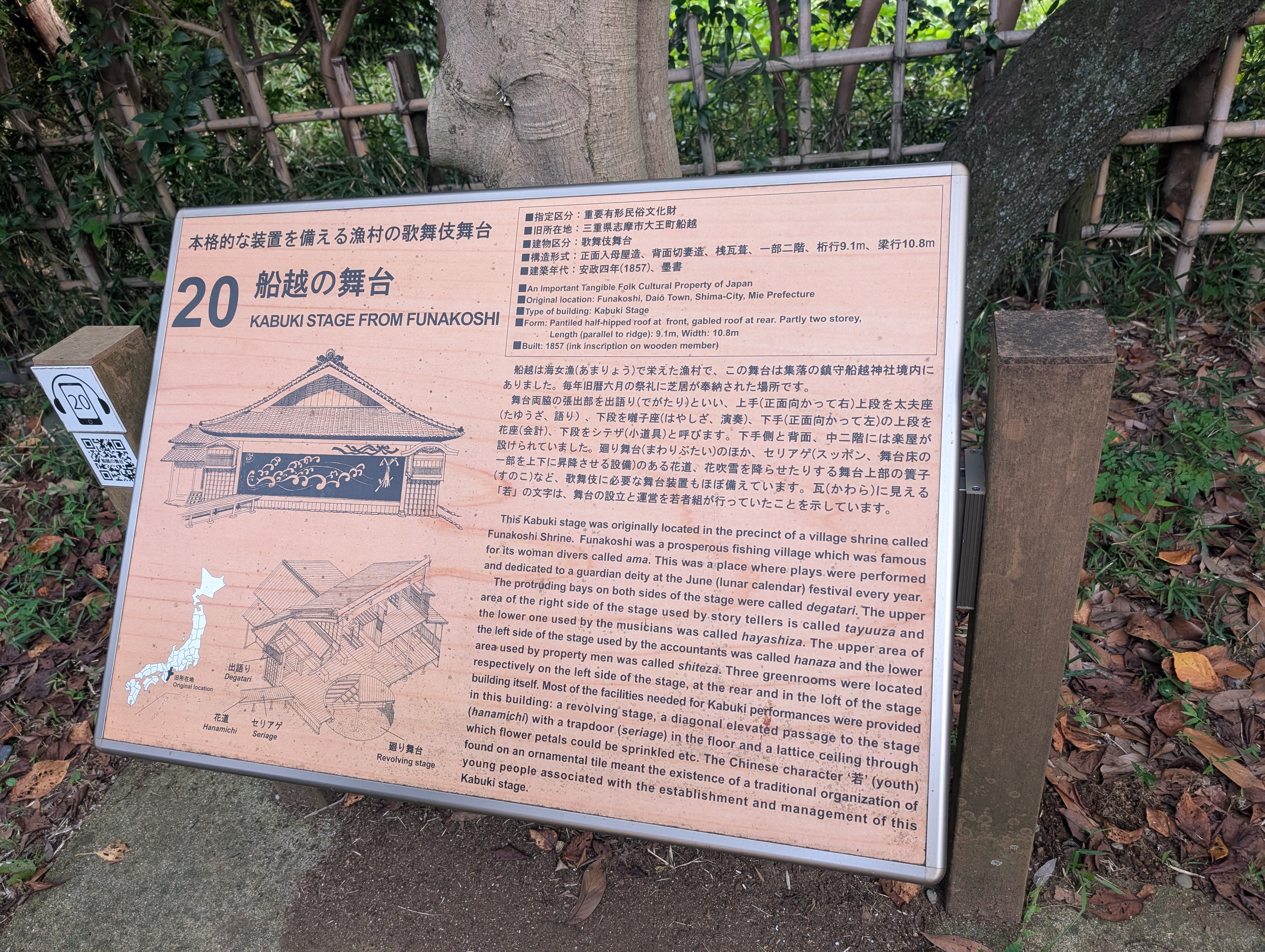 こちらは「船越の舞台」という歌舞伎舞台の解説板。漁村の鎮守の森にあったものを移築したそうです。民家だけでなく、人々の娯楽や文化を支えた建造物もしっかりと保存されています。年間を通してここで民俗芸能公演などの催しも行われています。