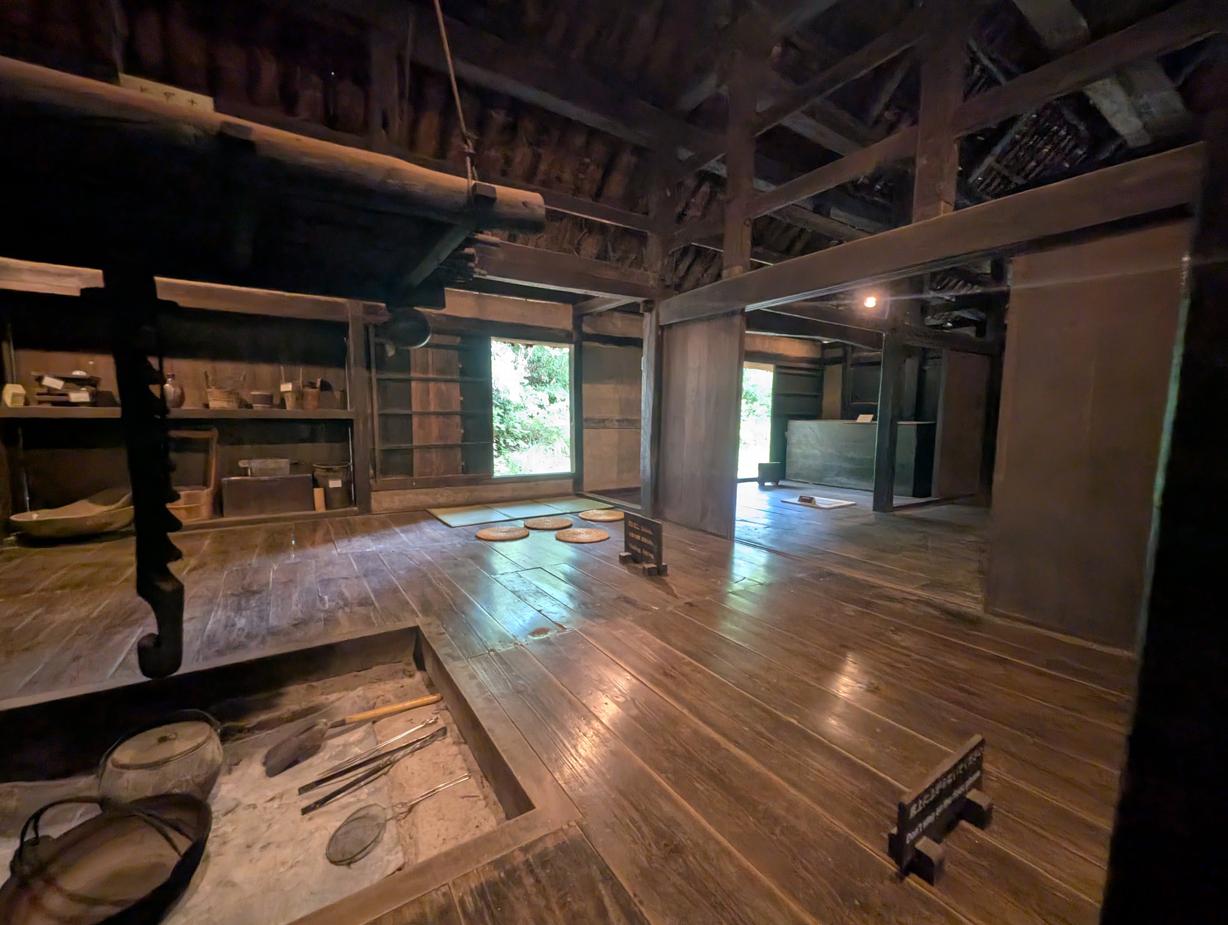 さあ、いよいよ家の中へ!立派なかまどが並ぶ土間から、奥の板の間(リビング)を見た様子です。黒光りする太い柱や梁からは、何世代にもわたって人々を包み込んできた歴史の重みが感じられます薄暗い家の中に差し込む自然光が、囲炉裏の周辺を優しく照らしています。昔の人々はここで暖を取り、食事をし、家族の団欒の時間を過ごしたのですね。ノスタルジックな雰囲気に胸がぎゅっと掴まれます。