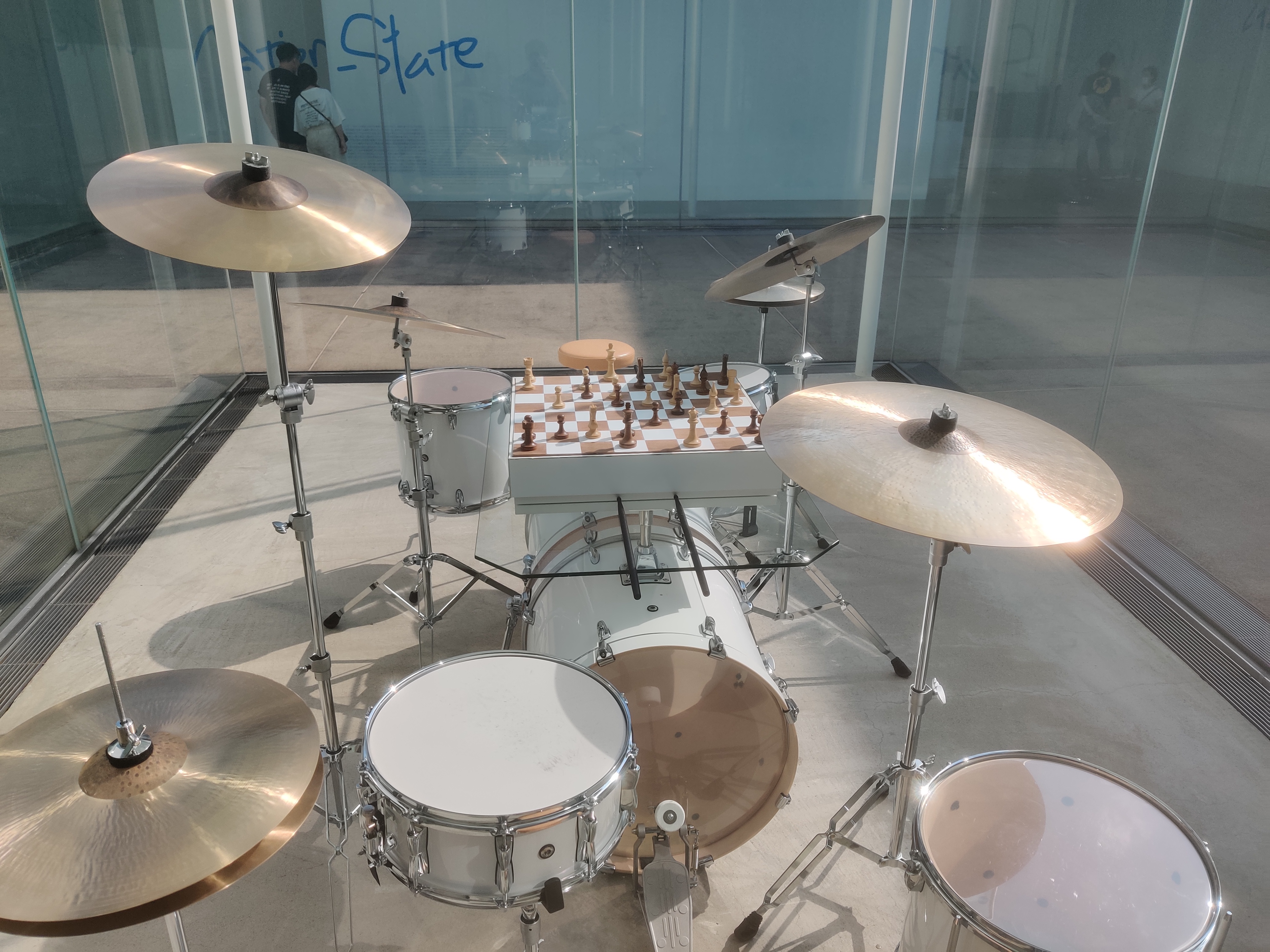 📷 写真のポイント:館内を歩いていると、こんなハッとするようなユニークな作品との出会いも。ドラムセットの上にチェス盤!?ガラス張りの空間と相まって、現代アートの自由さを肌で感じられます。